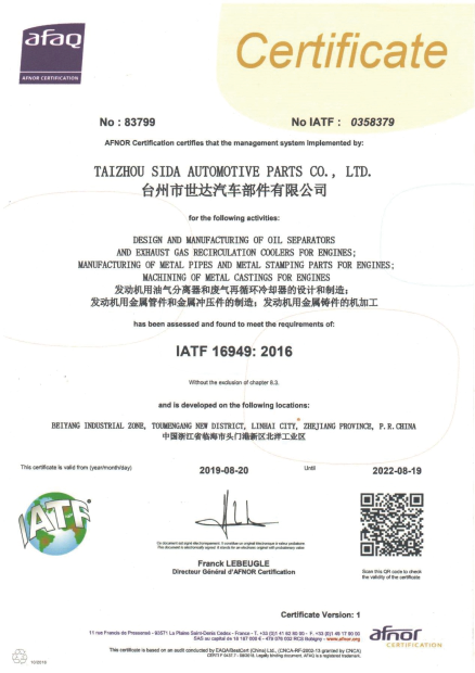 台州市世达汽车部件有限公司是浙江省成长型中小企业重点培育企业,获得了临海市五十强企业、台州市清洁生产企业、台州市高新技术企业等荣誉称号。公司重视人才培养,注重产品开发,与国内外汽车制造商和各高校长期合作,拥有一流的实验检测设备,并获得国家发明专利。在杭州浙江大学创业园成立“伟达研发中心”建立了完善的管理体系和质量保证体系,公司已通过IATF16949国际质量体系认证和ISO14001体系认证。